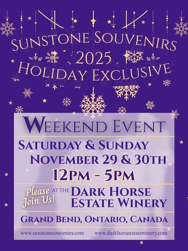 Sunstone Souvenirs is happy to announce a two day retail event at the Dark Horse Estate Winery in Grand Bend, Ontario, Canada on Saturday, November 29th and Sunday, November 30th from 12pm - 5pm. Stay Tuned! Crystals and wellness products for you and your loved ones this holiday season
